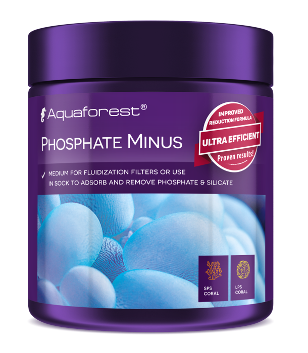 - Příliš mnoho krmiva či aplikace doplňkových přípravků může být příčinou příliš vysoké hladiny fosfátů. Díky unikátní technologii produkt Phosphate Minus účinně snižuje hladinu fosfátů a silikátů v mořských akváriích. Díky své adsorpční schopnosti umožňuje vázání velkého množství fosfátů bez negativního vlivu na obyvatele akvária. Používání Phosphate Minus se doporučuje jak u nových, tak u již zajetých akvárií.