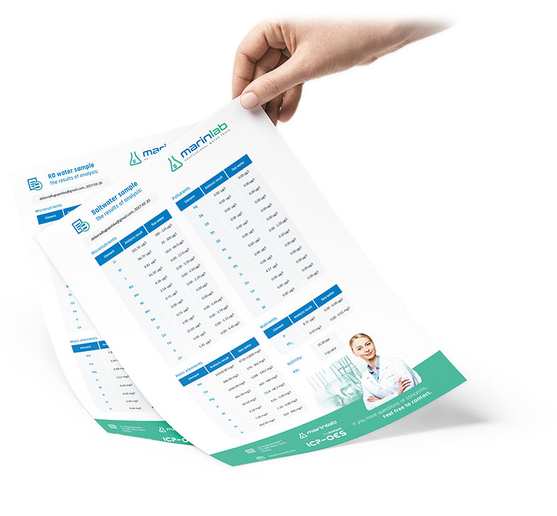 V naší laboratoři testujeme: Li, Si, I, Ba, Mo, Ni, Mn, Be, Cr, Co, Fe, V, Zn, Hg, Se, Cd, Sn, Sb, As, Al, PB, Ti, Cu, La, Sc, W, Na, Ca, Mg, K, Br, B, Sr,S, P, PO4 + Salinity & KH!