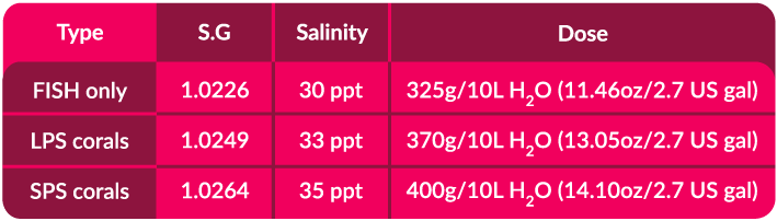 Sůl rozpusťte v předem připravené demineralizované vodě (RO). Teplota vody by měla být asi 24°C. Pro dosažení salinity 30ppt je třeba rozpustit cca 345g soli v 10 litrech vody (27 US gal). Roztok se intenzivně míchá pomocí čerpadla cca 15 minut. Když je sůl zcala rozpuštěna a roztok je čirý, čistá voda je připravena k použití. Sůl uchovávejte na suchém a tmavém místě . Po rozpuštění doporučujeme mořskou vodu použít do 5 dnů .