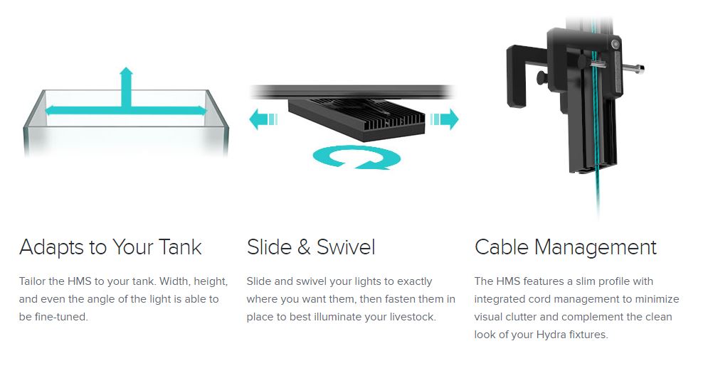 Nový systém zavěšení Hydra Mounting System (HMS™) je navržen tak, aby se dal jednoduše používat pro upevnění LED osvětlení řady Hydra 26/52 a novější řady Hydra 32/64HD.