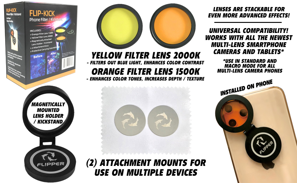 Vyfoťte dosud nejlepší fotky akvária! Díky Univerzálnímu fotografickému filtru na objektivy chytrých telefonů „Flip-Kick“ a stojánku Kick-Stand!