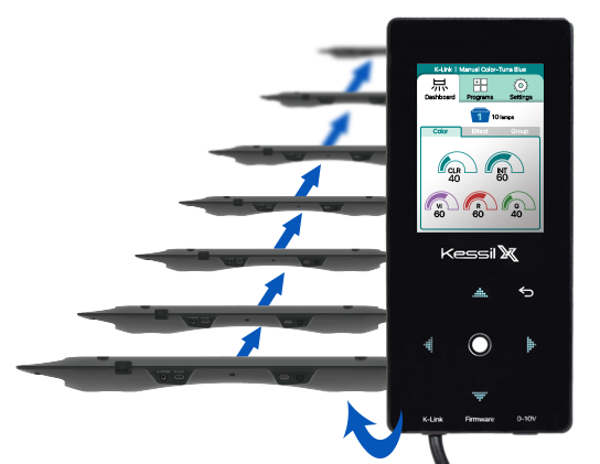 With two K-Link and two 0-10V control ports, the AP9X can be easily wired to adjacent Kessil fixtures. Lights in a wired group can then be app-controlled via the AP9X’s WiFi connection. A single AP9X can act as the wireless access point for up to 32 X-Series lights and 20 0-10V lights.