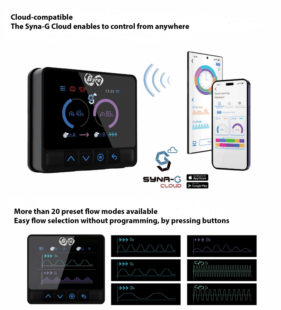 Nová čerpadla Gyre řady Cloud Edition 300 jsou vybavena pokročilým ovladačem s velkým 8cm barevným TFT LCD displejem, s více než 20 předvolbami proudění, WiFi připojením a možností ovládat čerpadla odkudkoli na světě prostřednictvím aplikace Syna-G Cloud. Aplikace umožňuje připojit a ovládat všechna kompatibilní zařízení Maxspect včetně světel prostřednictvím chytrého zařízení se systémem Android nebo iOS.