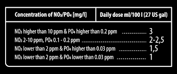 Doporučuje se začít s přípravkem NitraPhos Minus na polovině doporučené dávky. Koncentraci NO3 a PO4 se doporučuje sledovat jednou až dvakrát týdně. Doporučená denní dávka je uvedena níže: