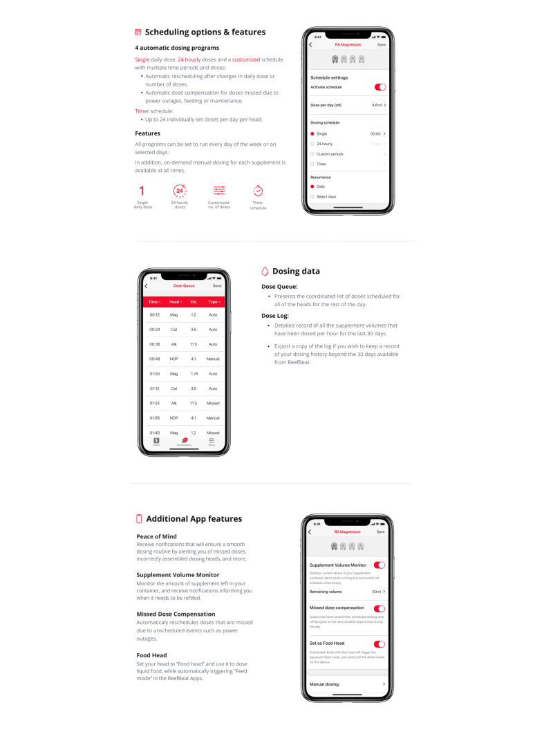 ReefDose využívá zakázkové (patentově schválené) dávkovací hlavy s přesností na jednu kapku spolu s pokročilým ovladačem, který poskytuje kompletní sadu funkcí.