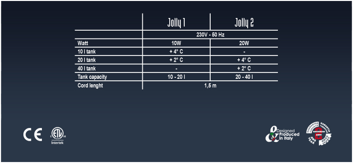 Pokud je topítko JOLLY ponořené, je vždy zapnuté. Přestane fungovat pouze po odpojení. Vestavěná tepelná ochrana zasahuje, když ohřívač není pod vodou, a zabraňuje tak přehřívání (LED kontrolka zhasne, i když je Jolly zapojený). Výkon se může lišit podle následujících parametrů: - Množství vody - Pokojová teplota - Otevřená nebo uzavřená nádrž.