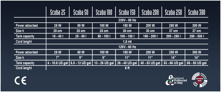 Navrženo a vyrobeno v souladu s mezinárodními bezpečnostními standardy. SCUBA je zcela ponorné topení.