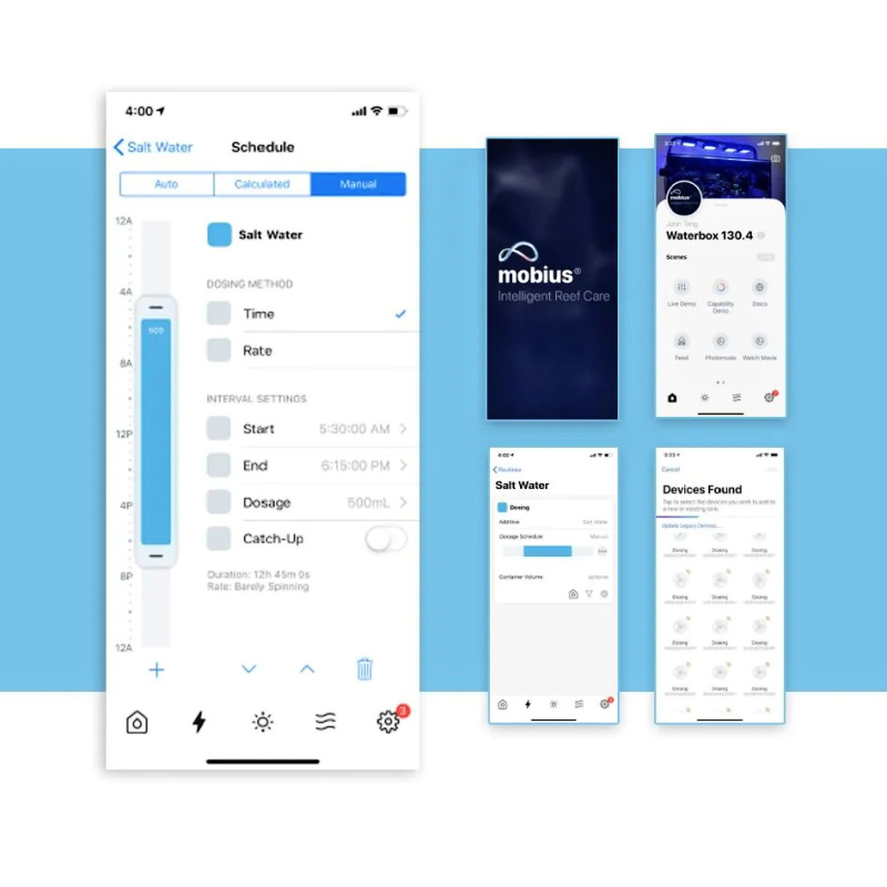 Zahrnuje bezpečnostní opatření, "catch-up" a řadu dalších funkcí. Charakteristickým rysem zařízení EcoTech je univerzálnost a možnost kontroly, které nabízí akvaristům. Aplikace Mobius všechny tyto funkce sdružuje tak, aby programování a ovládání bylo intuitivní, rychlé a snadné.